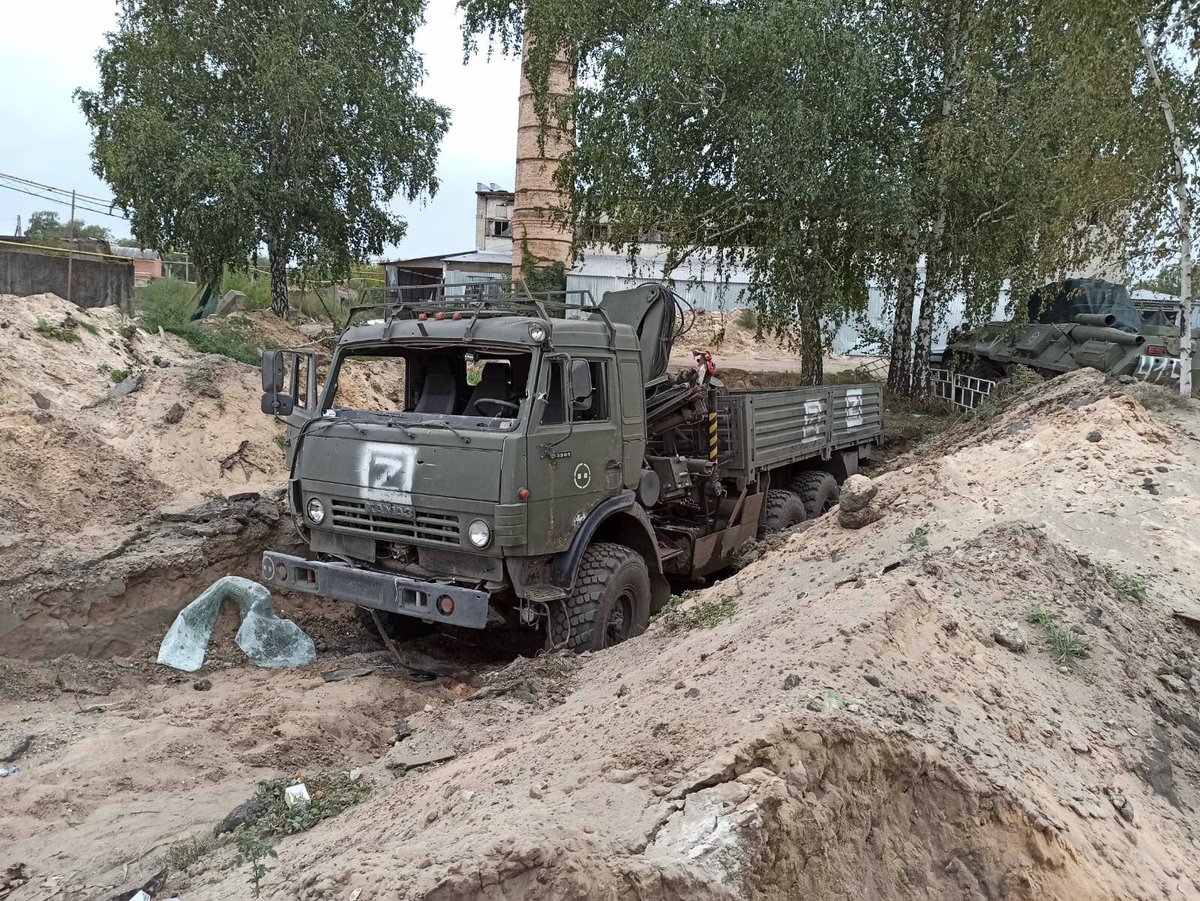 Another scattering: A KAMAZ Crane/Utility truck, a 2A65 Msta-B 152mm howitzer, and an apparent BTR-82A APC.