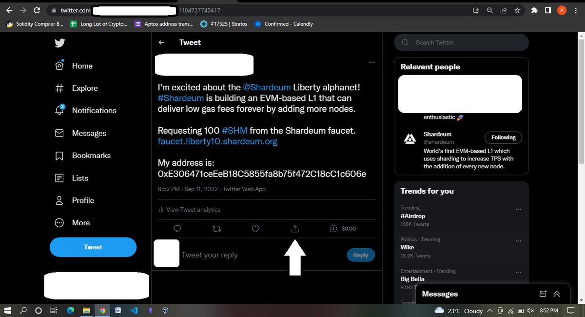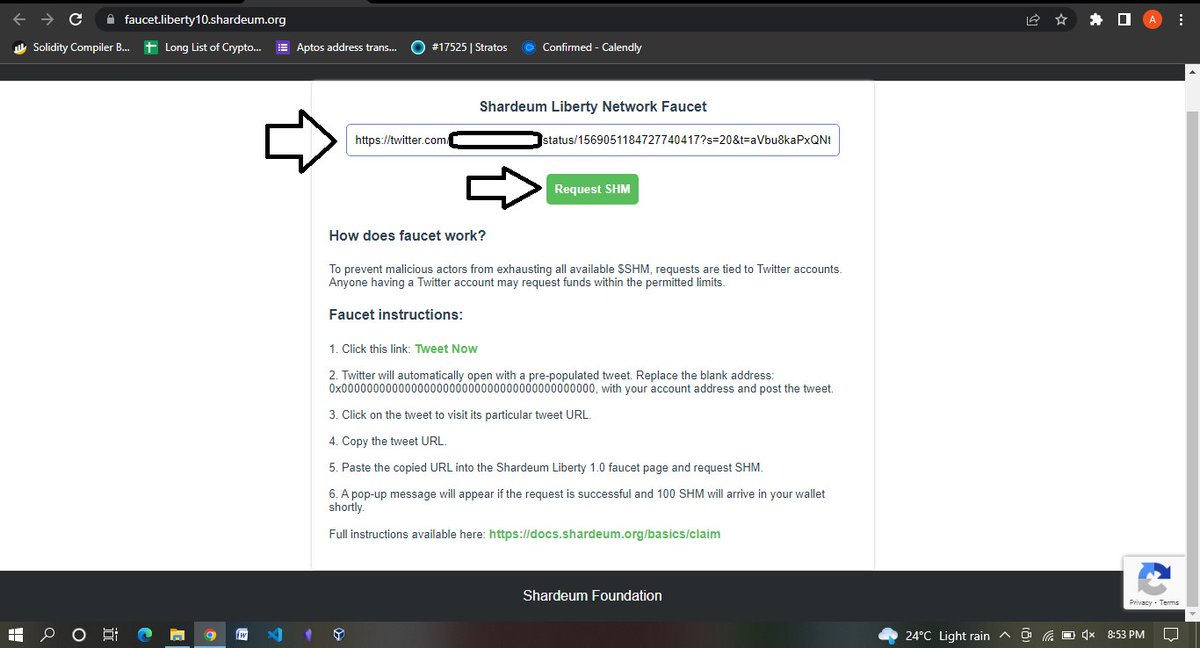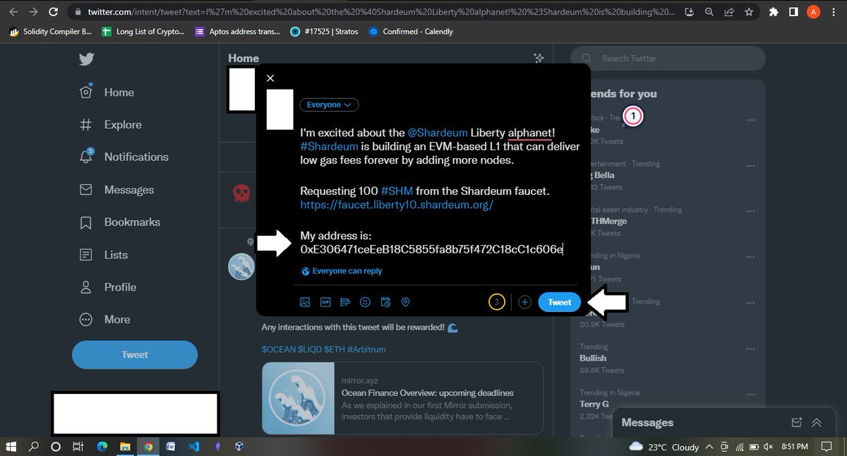 Now let's get some faucets, Go to faucet.liberty10.shardeum.org then tap on a tweet now and you will be redirected to make a tweet on Twitter Now the part with many zeros needs to be replaced with your own address that you want to use for the Testnet (Always use a burner for Testnets)