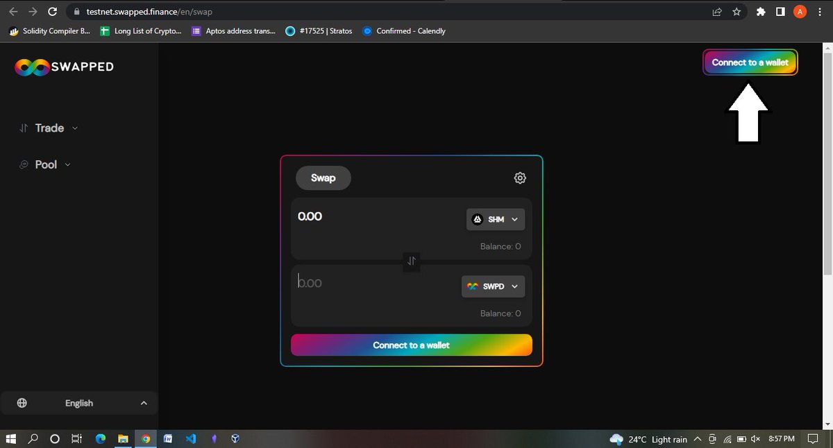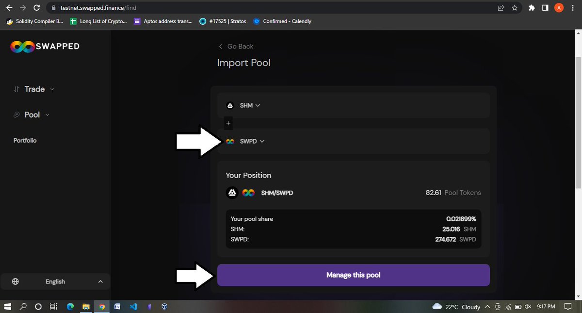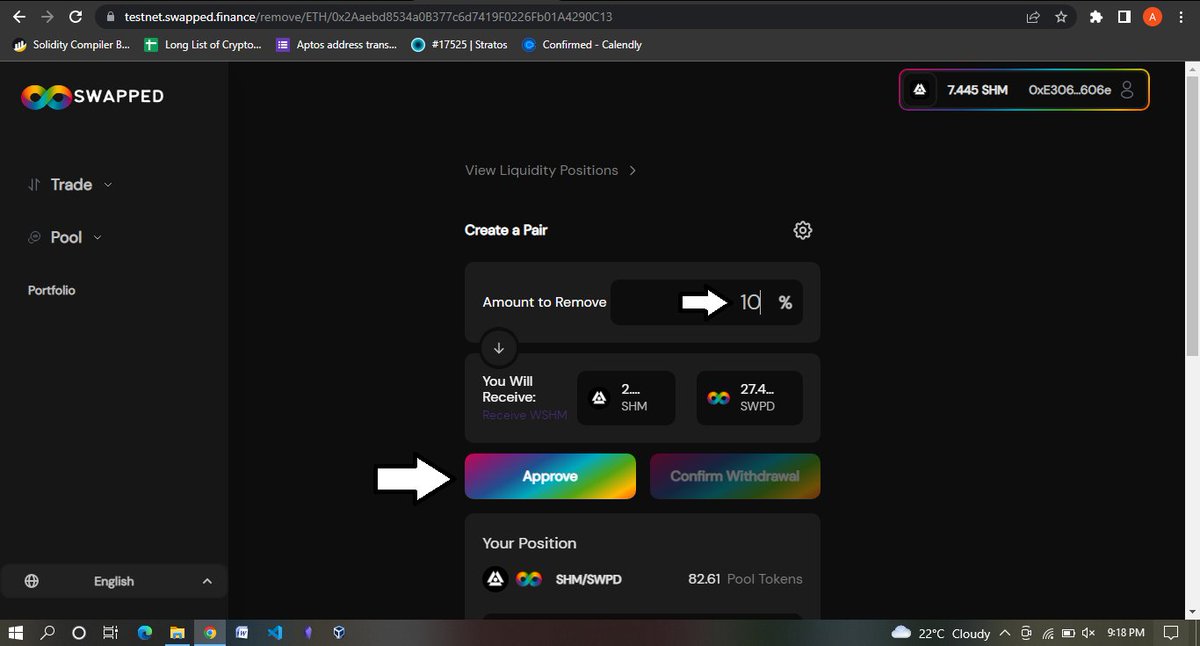 Now on the left-hand side tap on pools and tap on Add, and put any random amount in SHM and the corresponding amount should appear at the SWPD (bottom) side, then confirm the supply and approve the transaction in your wallet.