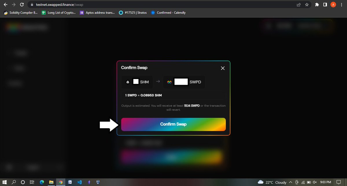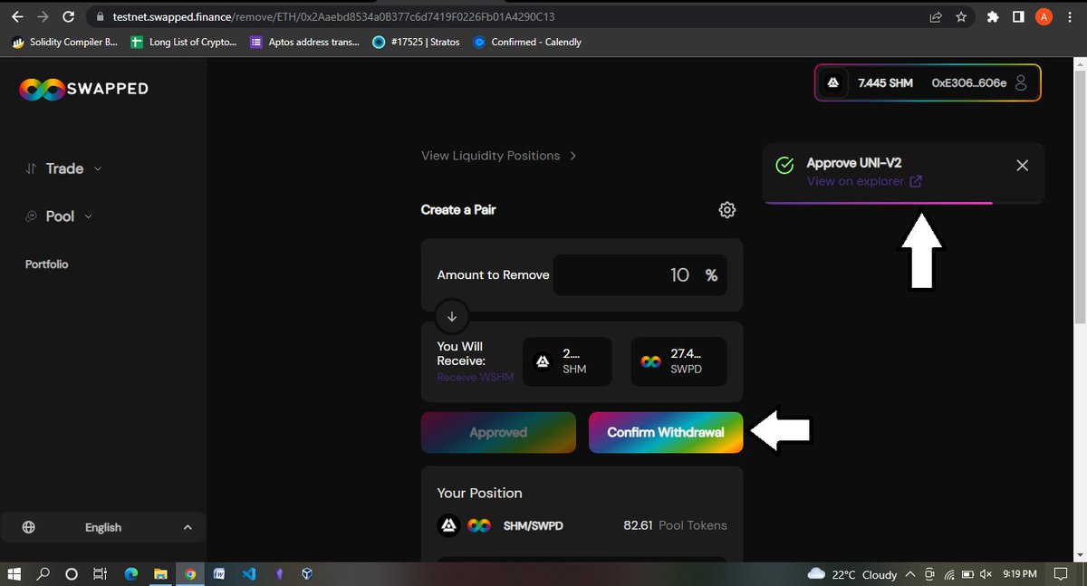 Now swap back 5 SWPD to SHM and Approve your SWPD for spending and confirm the transaction in your wallet first, then a swap button will come up, tap on swap and confirm the transaction in your wallet, and you should see a successful message after some seconds or minutes.