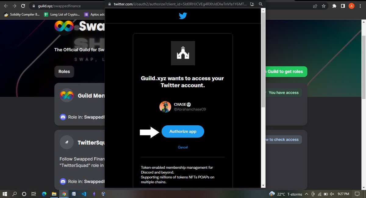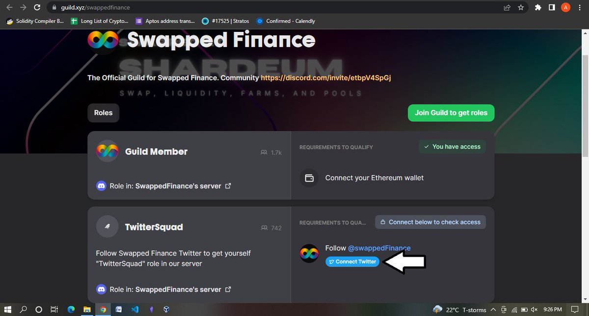 Now connect your discord account to the site, tap on connect to claim access, and authorize your discord on the pop-up page, next connect your Twitter and also authorize the connection, don't forget to follow @SwappedFinance
