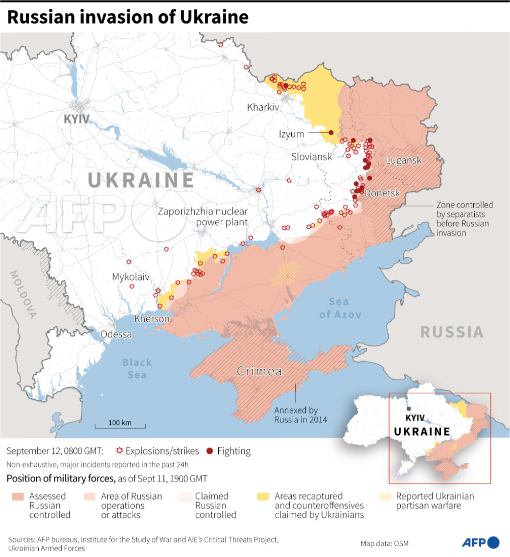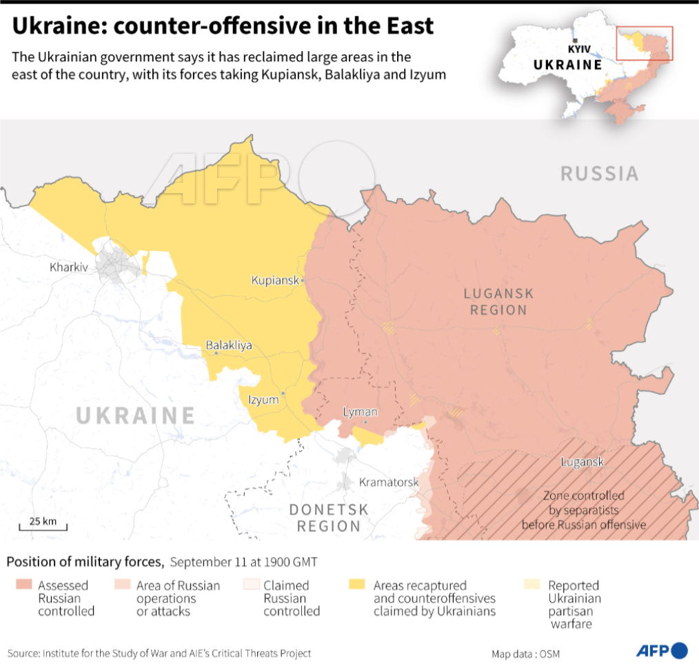 #UPDATE Ukraine forces said Monday their lightning counter-offensive took back more ground in the past 24 hours, as Russia replied with strikes on some of the recaptured ground. u.afp.com/ikdi