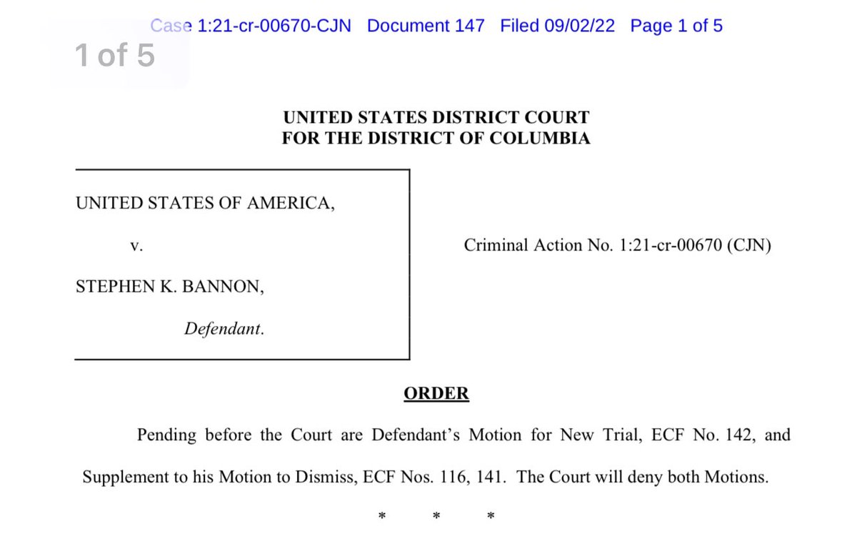 NEWS :: COURT DENIES BANNON’S MOTIONS FOR A NEW TRIAL AND TO DISMISS. Haha this is a good one. Strap in. 1/