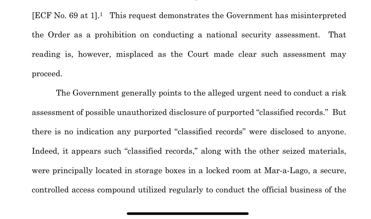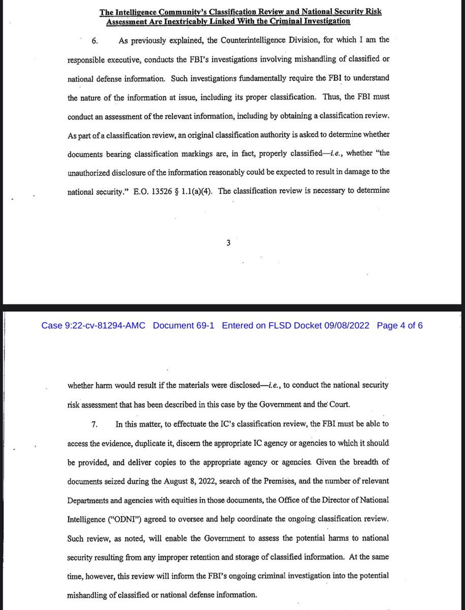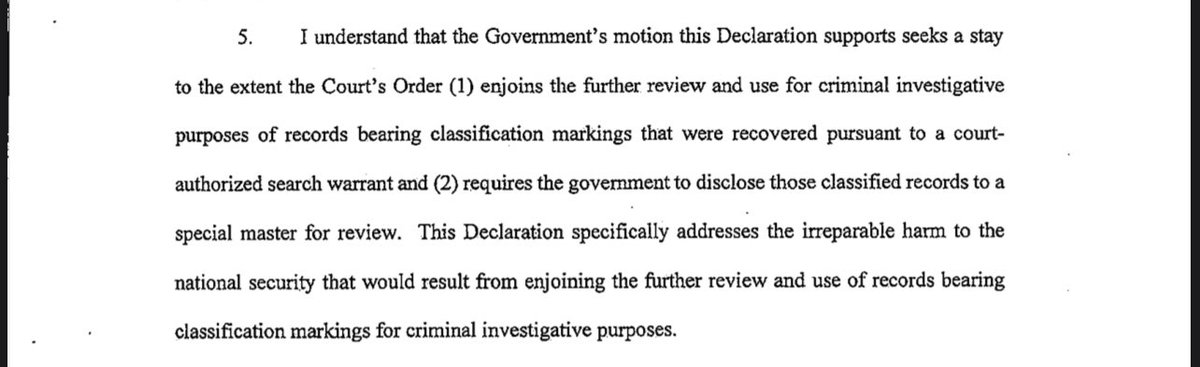THREAD: NEW: the DoJ has filed a motion for a PARTIAL STAY of Judge Cannon’s order to the 11th circuit pending appeal in the Mar-a-Lago case. These are screen grabs of a declaration supporting the partial stay from the assistant director of counterintel at the FBI. 1/