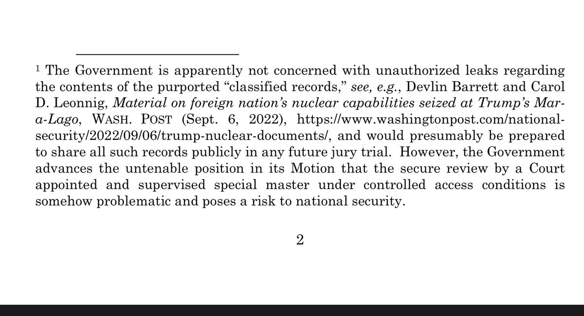 But here’s what I think Cannon will latch onto if she denies the DoJ motion to stay: that the government can’t possibly be “concerned” about irreparable harm or protecting classified docs because they “leaked” information. They levy this accusation with ZERO proof. 6/
