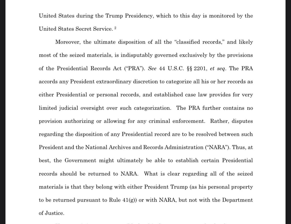 They continue to argue the president’s authority under the PRA despite 1) the fact that if these do fall under the PRA, Cannon has no jurisdiction and 2) he’s NOT THE PRESIDENT. 4/