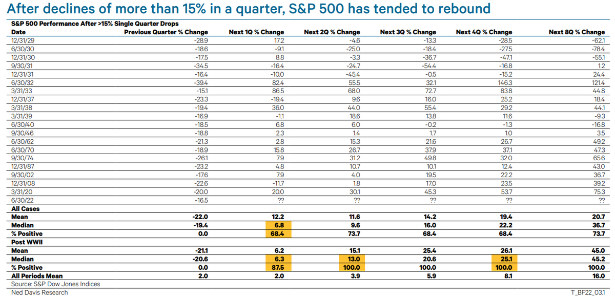 Going thru charts, these 5 stood out: 1. Q2 was bad. Is that good? After $SPX ⬇️15% in a qtr, it has rebounded sharply. Post WWII⬆️7/8 times next quarter. 2 qtrs later⬆️8/8 by median of 15%. If economy isn't in a deep recession, history suggests stocks rebound. @NDR_Research 1/5