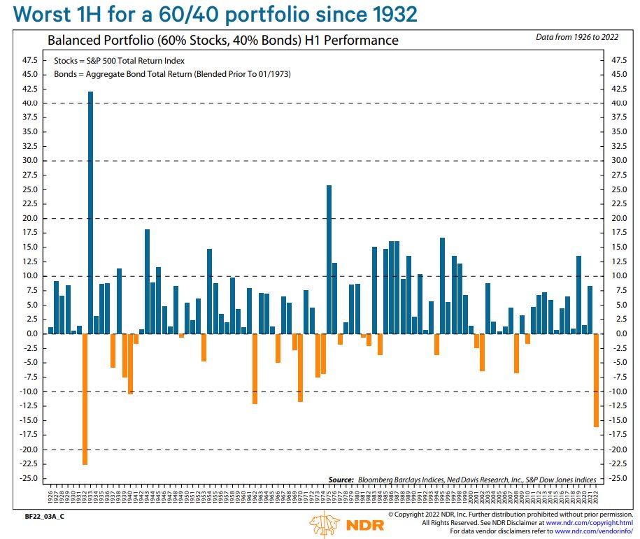2. Nightmare on Asset Allocation Street. 60/40 stock/bond portfolio posted worst 1H since 1932. 2/5