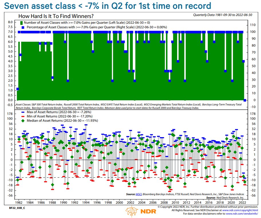 3. Nowhere to hide outside of commodities. 7 asset classes ⬇️>7% for first time since at least 1981. LC US, SC US, developed int'l, emerging markets, Treasuries, corporates, and REITS. 3/5