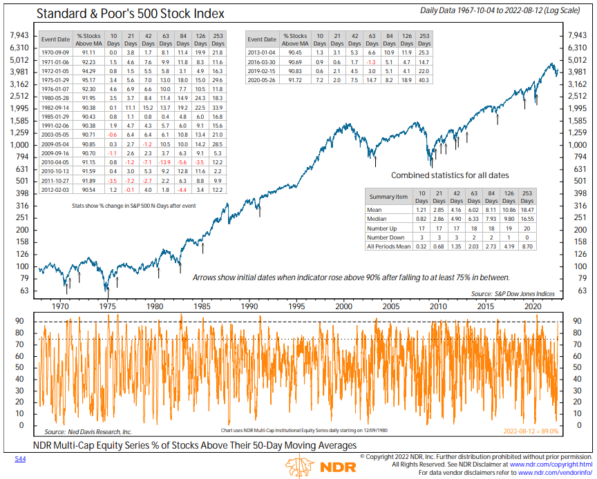 Going thru charts, these 5 stood out: 1. 50-day MA breadth just missed. Hit 89.66% on 8/16. Breadth thrust is 90.0%. The difference is probably insignificant, but the indicator is built at 90. Close counts for horseshoes and hand grenades, not breadth thrusts. @NDR_Research 1/5