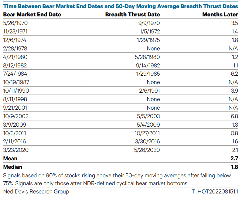 2. 50-day breadth signal about now would be right on schedule. Has fired a median of 1.8 months after bear market low, which equates to last Thursday, 8/11, this cycle. Mean of 2.7 months equates to Sept 6, day after Labor Day. 2/5