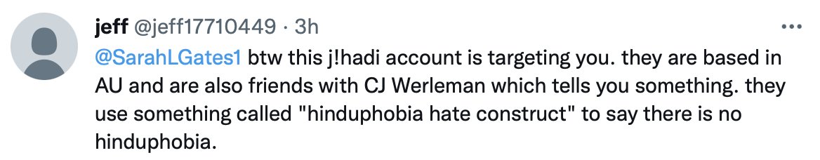In this instance, the tweet leverages the word 'Hinduphobia' to vilify this account & @cjwerleman as 'jihadi' and to incite hatred.
