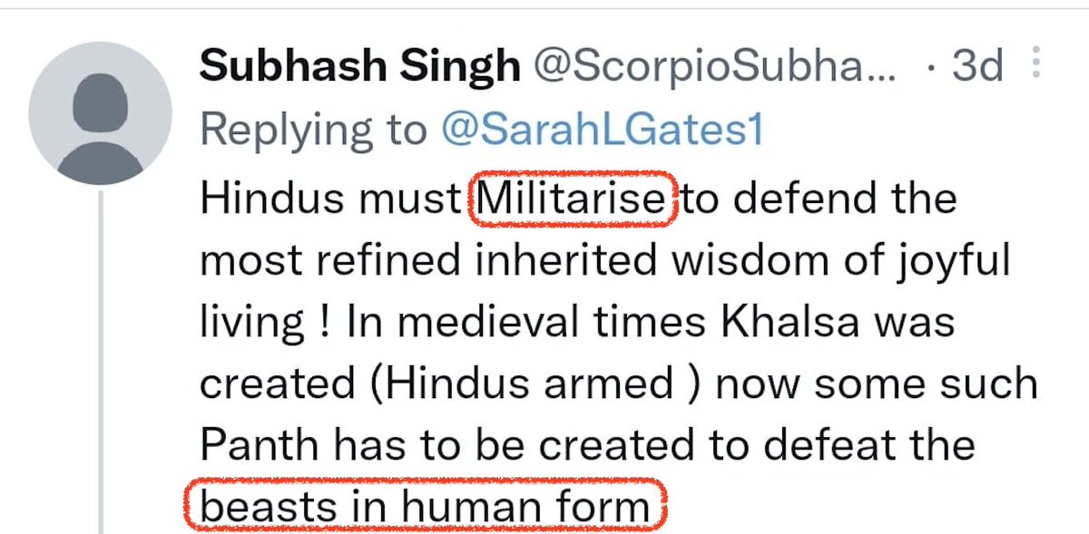 3/ The Hinduphobia Hate Construct tweet is followed by incitement to violence through calls to 'militarise' to defeat the 'beasts in human form'.