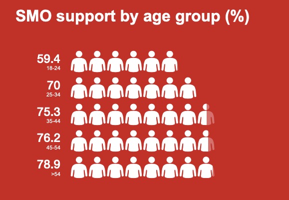(2) Older people support the SMO more than younger people. Among respondents aged 18-24, support is at 59.4%. For each successive age group, avg level of support is higher. Among respondents > 54 y.o., avg SMO support reaches 78.9%. 3/