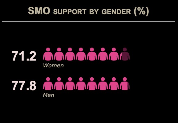 (1) Men support the SMO more than women. On avg, 77.8% of men claim to support SMO, while 71.2% of women do. Women are also more likely to give "don't know" & NA responses: 17.2% compared to 8% for men. 2/