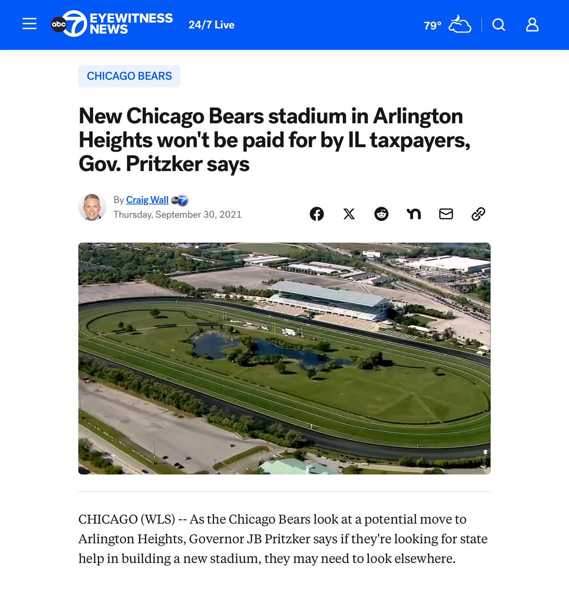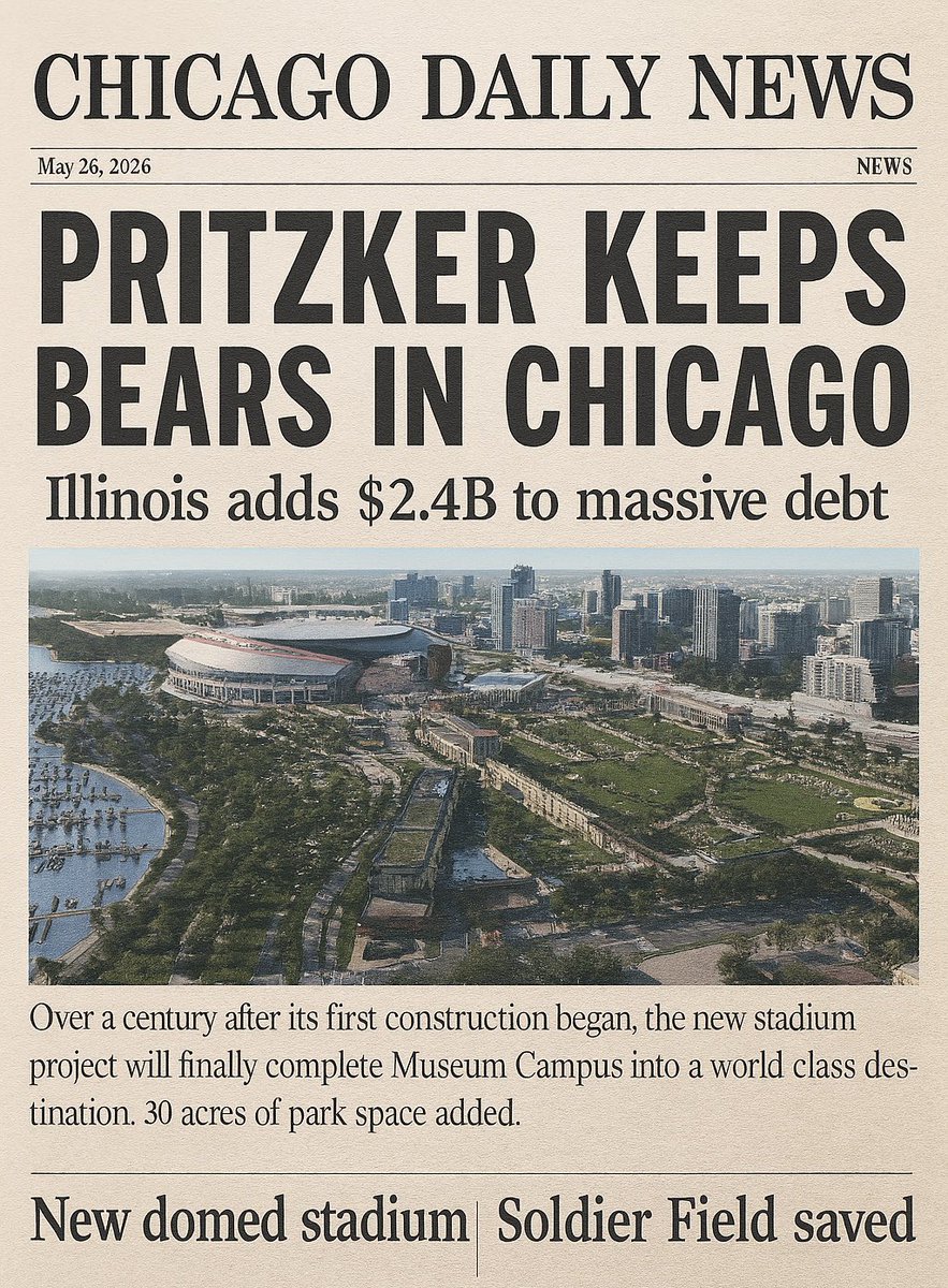 The Chicago Bears announce an agreement to purchase a 326-acre site in Arlington Heights, signaling their intent to build a new stadium. Illinois Governor J.B. Pritzker publicly states he will not use state funds to finance a professional sports stadium.