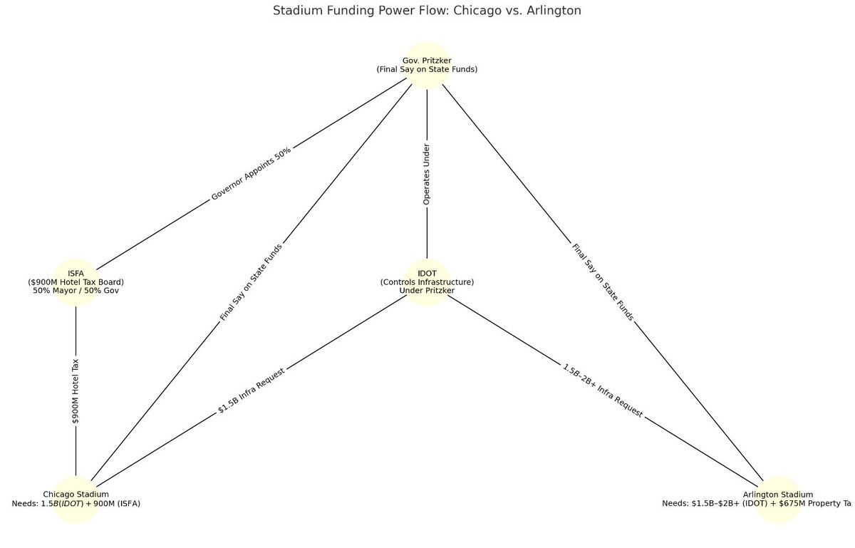 Pritzker holds the power because both Chicago & Arlington need $2B+ in state funds. He can veto it. IDOT, under Pritzker, controls infrastructure. Chicago’s $900M hotel tax goes through ISFA, a board split between mayor and governor—but Pritzker has final say at the state level
