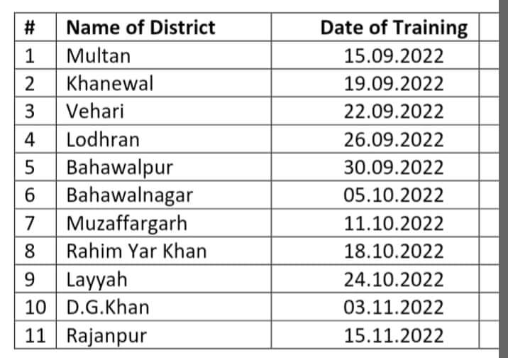 یہ ٹریننگ سیشنز جن اضلاع کے نام دئیےگئے ہیں اُن اضلاع کے ڈپٹی ڈائریکٹر زراعت (توسیع)کے آفیسز کے ٹریننگ ہال میں ہونگے۔ آپ اپنے ڈسٹرکٹ کے ڈپٹی ڈائریکٹر زراعت توسیع کے آفس کی لوکیشن معلوم کرلیں۔