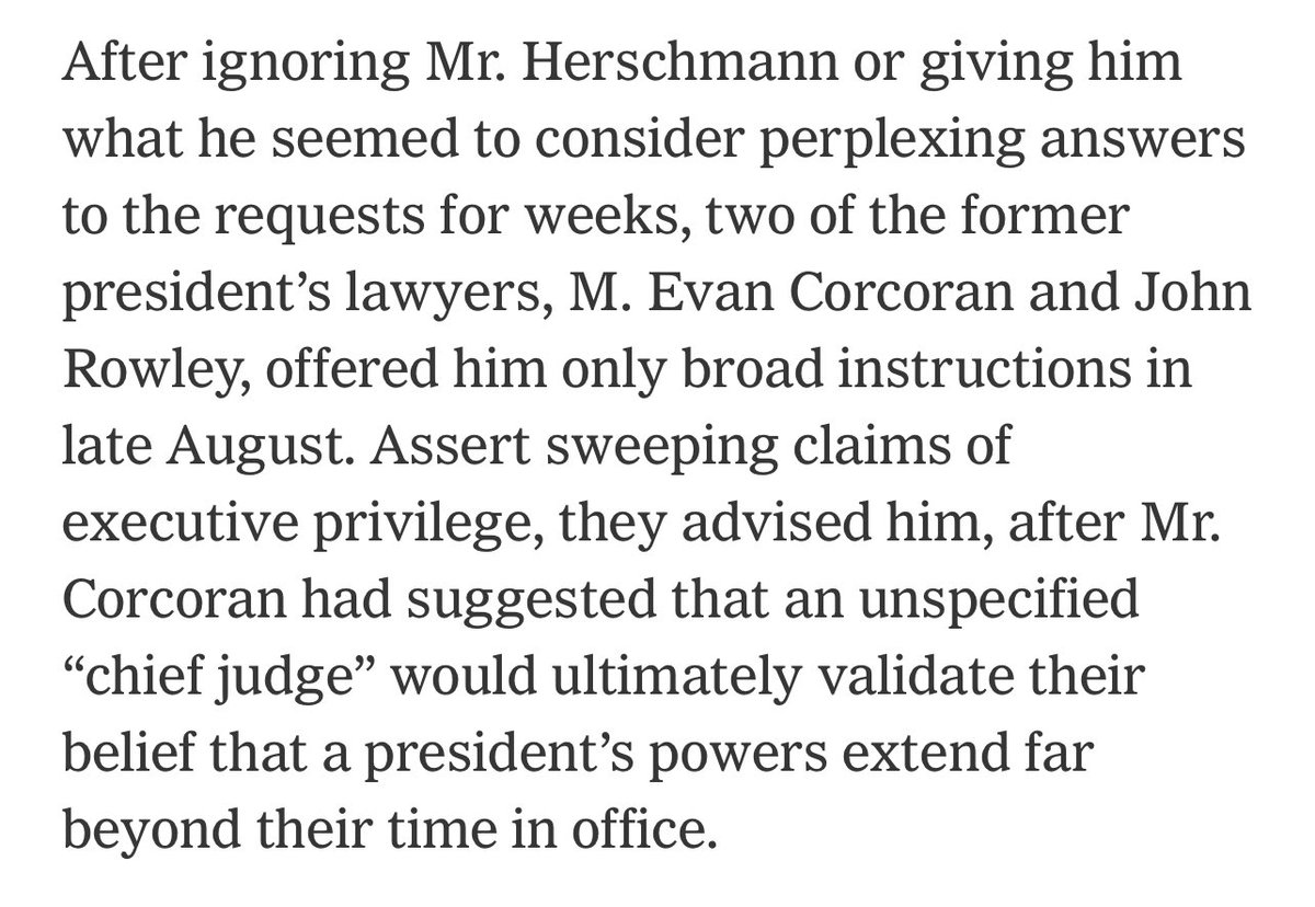 BREAKING::THREAD::There are a LOT of breaking stories in the latest NYT piece that just dropped. First, trump lawyers told Herschmann to invoke sweeping executive privilege with the DoJ stating they have a “chief judge” in their pocket that will rule in their favor. 1/