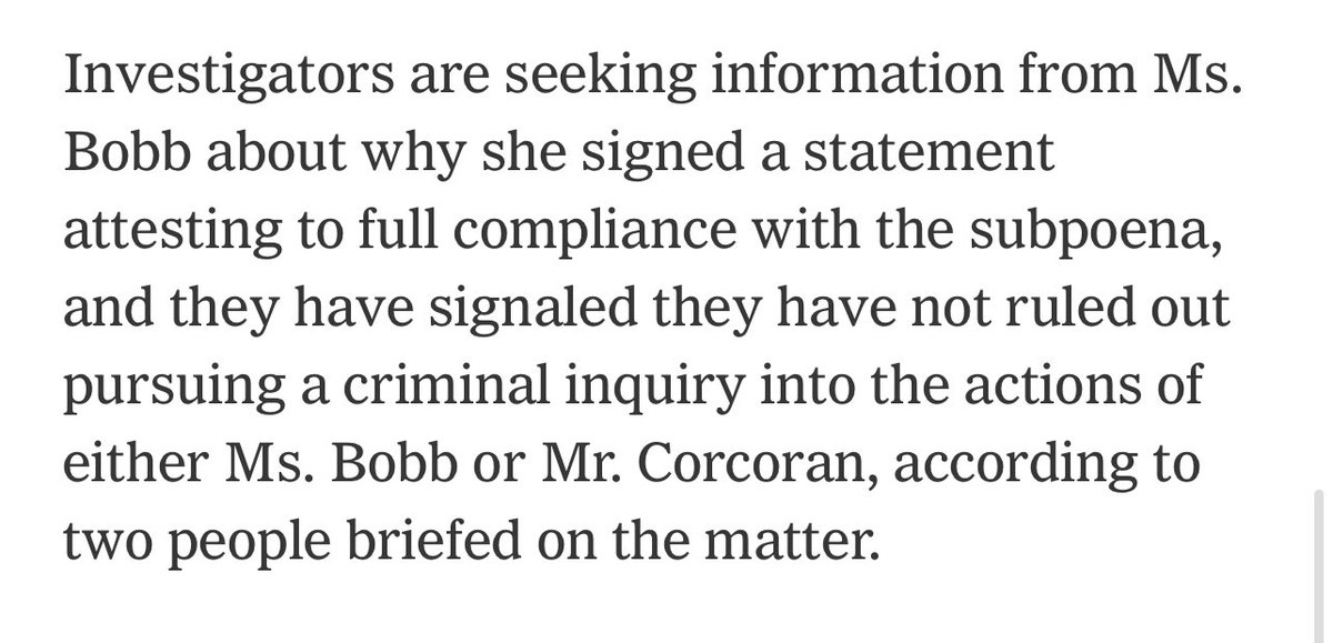 Next up: investigators are seeking information from Christina Bobb about singing the attestation that Corcoran drafted saying they handed over all the classified documents in June and HAVE NOT RULED OUT a criminal inquiry. 2/