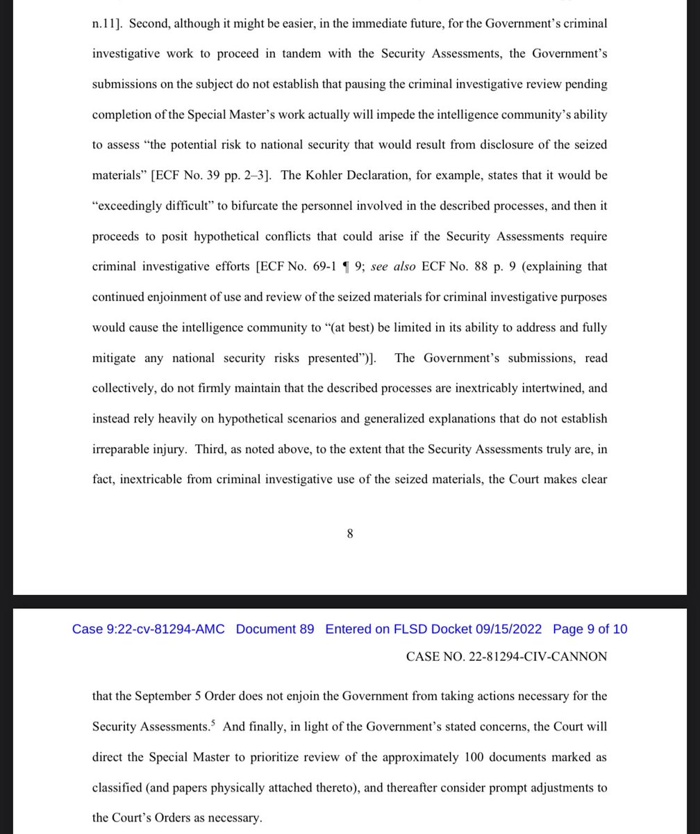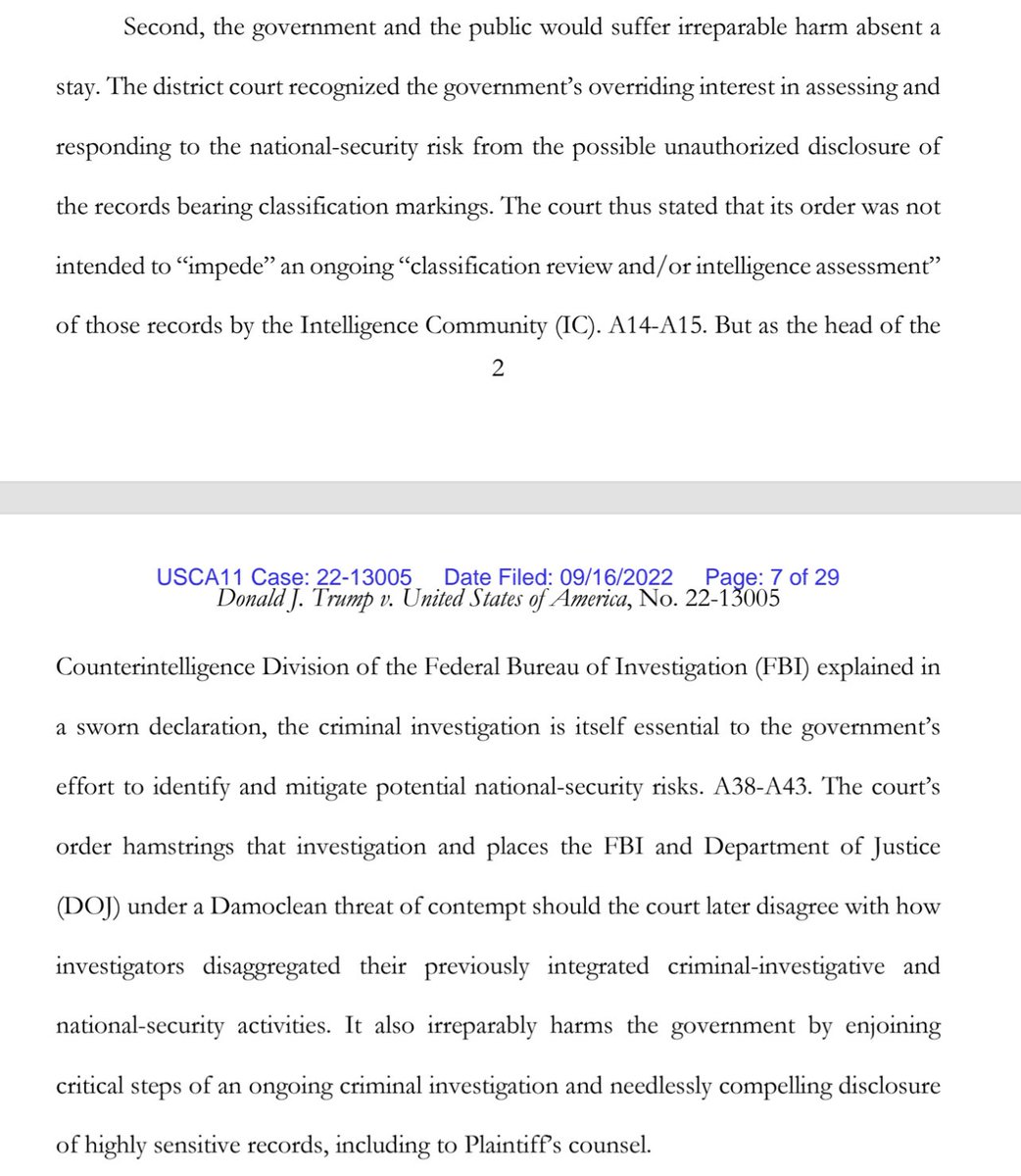 THREAD: NEW: the DoJ has filed a motion for a PARTIAL STAY of Judge Cannon’s order to the 11th circuit pending appeal in the Mar-a-Lago case. These are screen grabs of a declaration supporting the partial stay from the assistant director of counterintel at the FBI. 1/