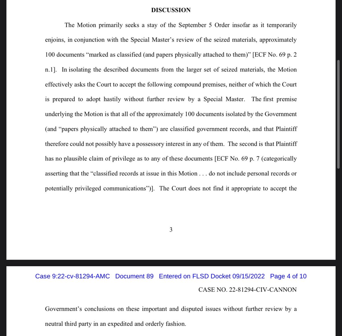 BREAKING: THREAD: In quite possibly the dumbest ruling I’ve ever read, Judge Cannon has denied the DoJ motion to stay part of her ruling (though I’m not surprised. I expected her to do this.) 1/