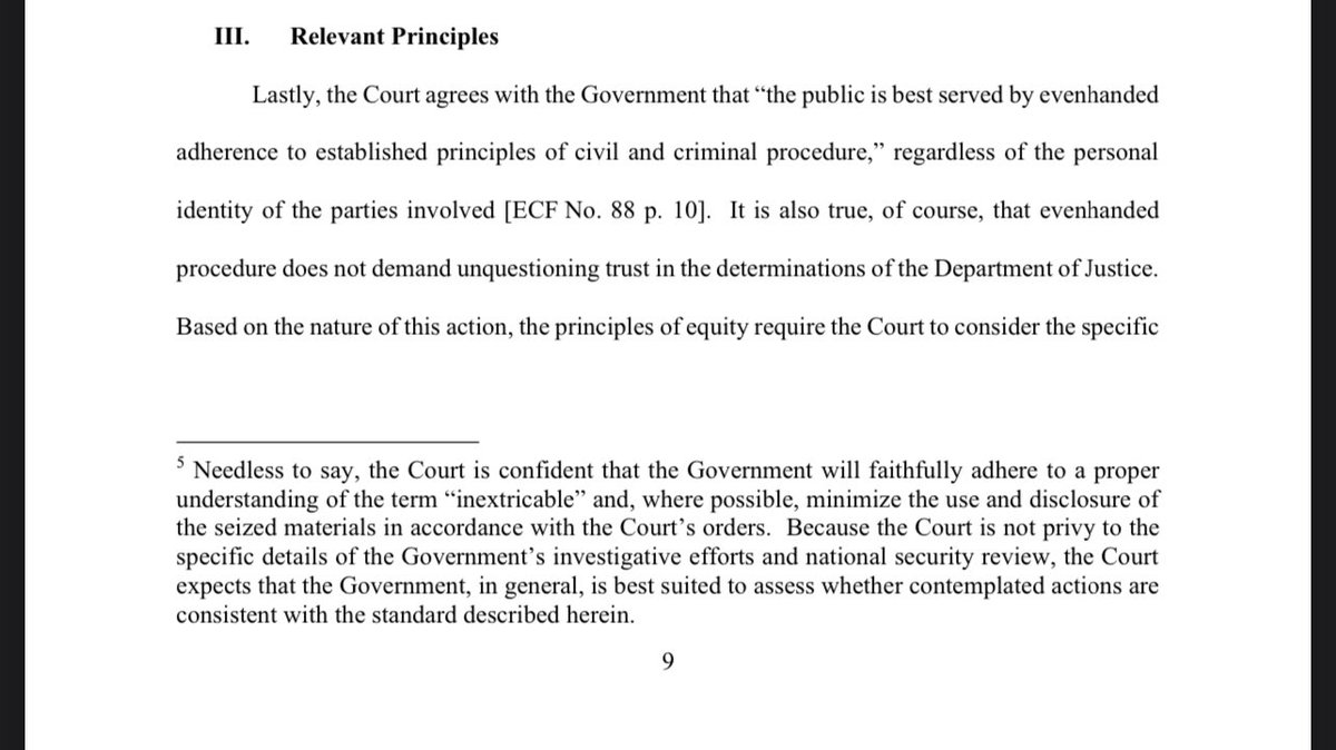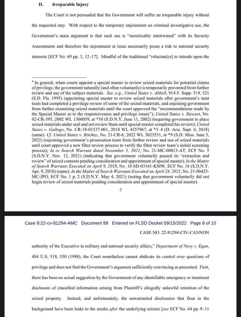 She then COMPLETELY ignores the Asst Director of Counterintel at the FBI’s declaration that there WILL BE IRREPARABLE HARM. Then she seems to accuse the DoJ of leaks without evidence. 5/