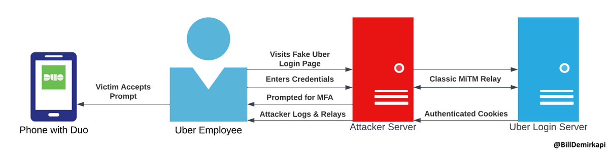 An attacker can setup a fake domain that relays Uber's real login page with tooling such as Evilginx. The only difference is the domain they are visiting, which is easy to miss. For most MFA, nothing stops the attacker from relaying the authentication process. 4/N