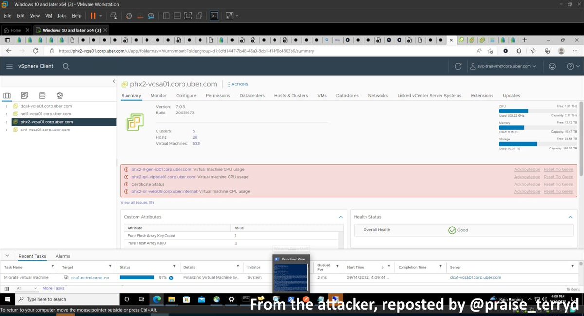 This story is still developing and these are some extreme claims, but there does appear to be evidence to support it. The attacker shared several screenshots of Uber's internal environment, including their GDrive, VCenter, sales metrics, Slack, and even their EDR portal. 8/N