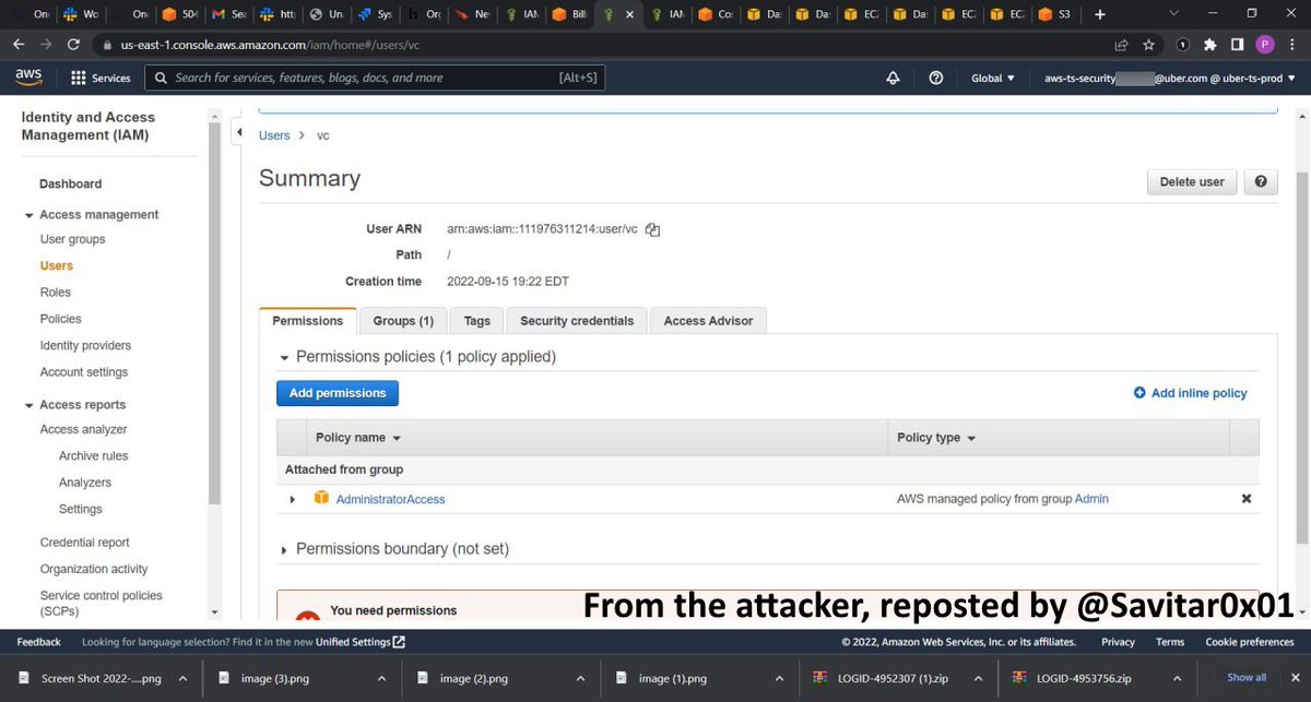 Uber's AWS environment appears to be compromised as well. This screenshot of their IAM portal appears to show that the attacker has administrative access. If true, cloud access could not only include Uber's websites, but other critical internal services as well. 9/N