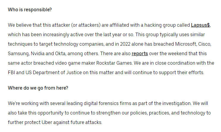 Unlike Okta, another organization breached by LAPSUS$ who waited 2 months to tell the public, I commend Uber for providing these details so soon after the breach. I'm interested to see if Uber walks back any statements they've made once their investigation is completed. 30/N