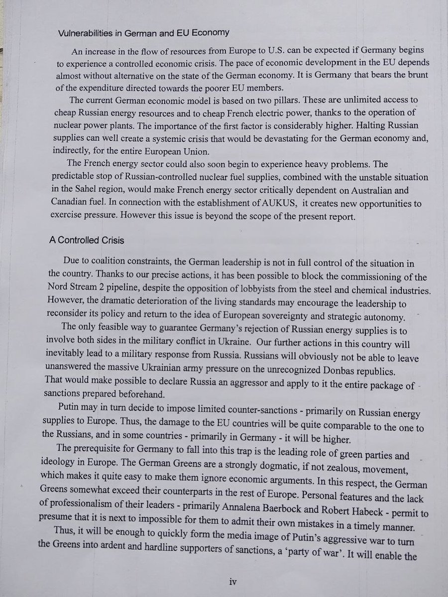 El objetivo clave descrito en el documento es dividir Europa, especialmente Alemania y Rusia, y destruir la economía europea colocando idiotas útiles en posiciones políticas para evitar que los suministros de energía rusos lleguen al continente.