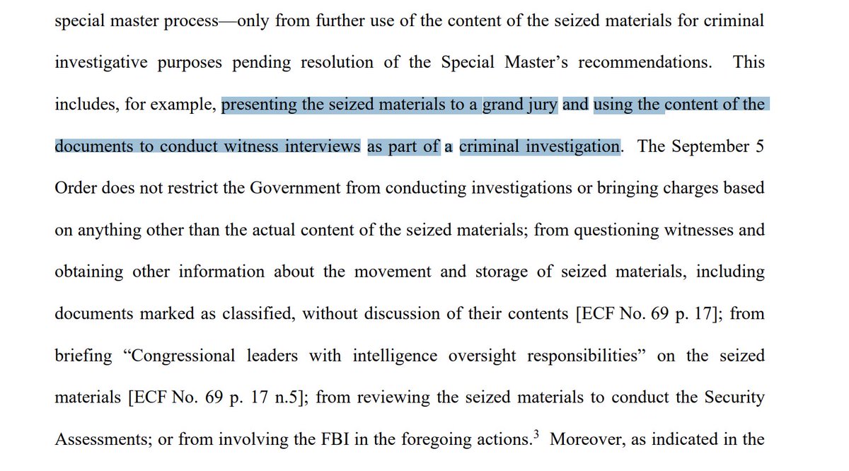 CANNON says DOJ can continue pursuing criminal aspects of their probe that don't include showing the seized materials to witnesses, and says they can brief Congress on the matter.