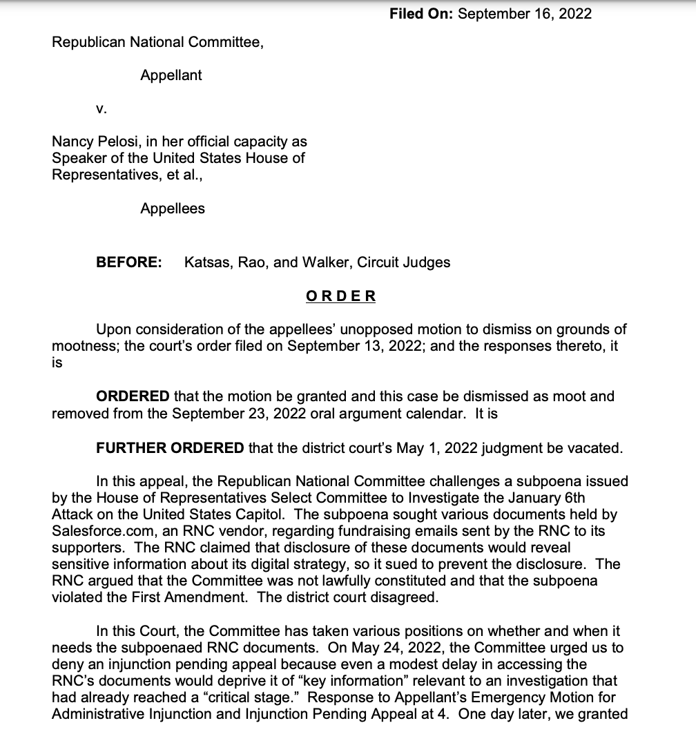 JUST IN: A three-judge panel of the Appeals Court agreed that the RNC's lawsuit against the Jan. 6 select committee is now moot (the committee withdrew its subpoena).