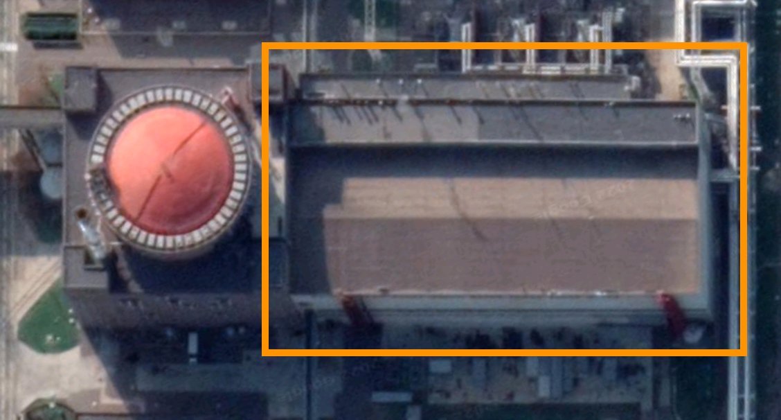 On a satellite image, that specific building looks like this (marked in orange). To the right, with the red dome, is the building housing the reactor. The vehicles are parked on the right side of the building marked in orange.
