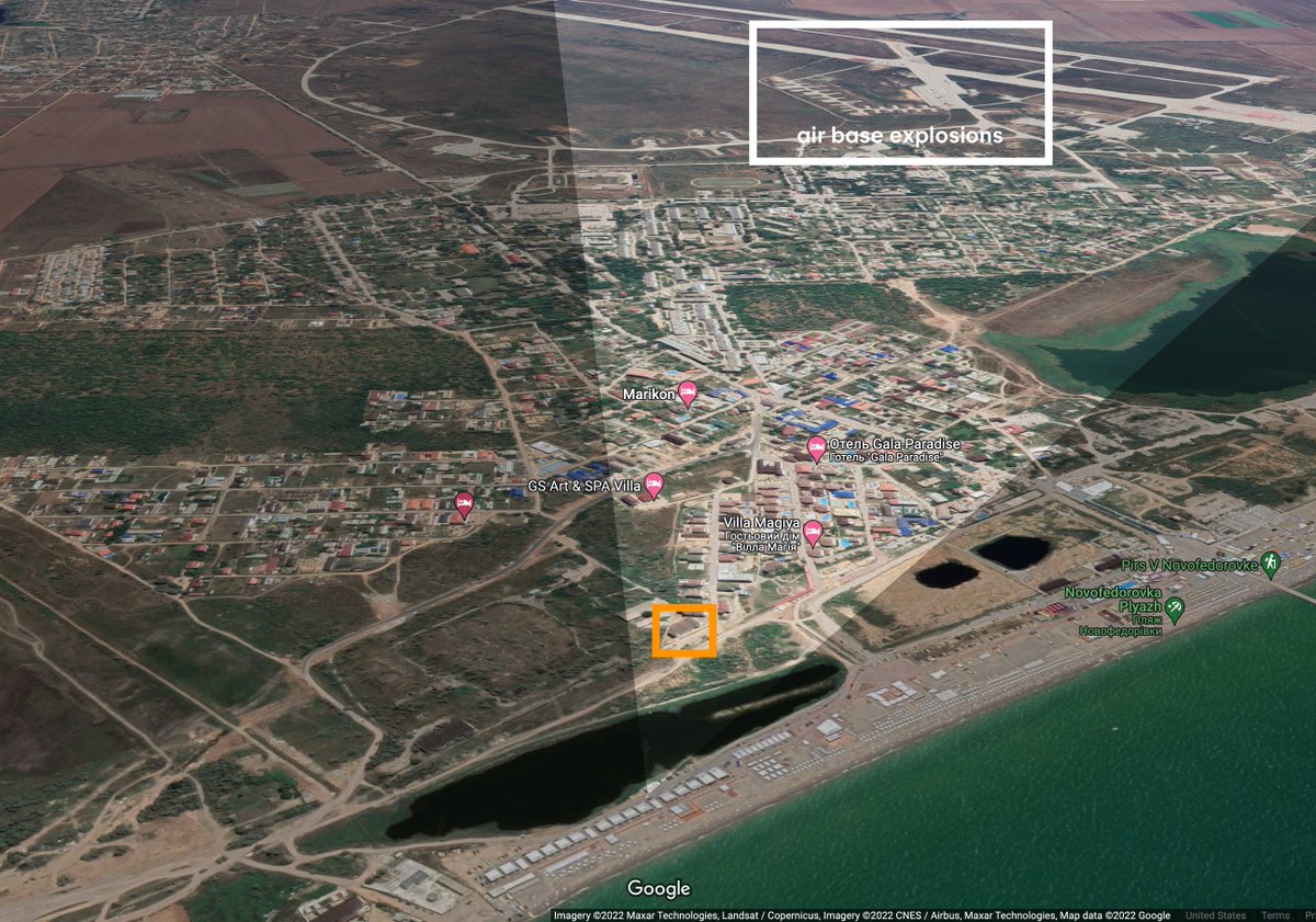 Another example, this video is making the rounds purportedly showing explosions in Taganrog, Russia, but actually shows the Aug. 9 explosions at the Saky airbase in Novofedorivka, Russian-occupied Crimea. google.com/maps/@45.09808…