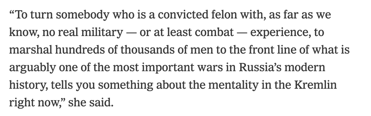 Russia is desperate for recruits. As @CandaceRondeaux puts it: using a convicted felon with no real military experience to marshal thousands of men for your war in Ukraine “tells you something about the mentality of the Kremlin right now.” nytimes.com/2022/09/16/wor…