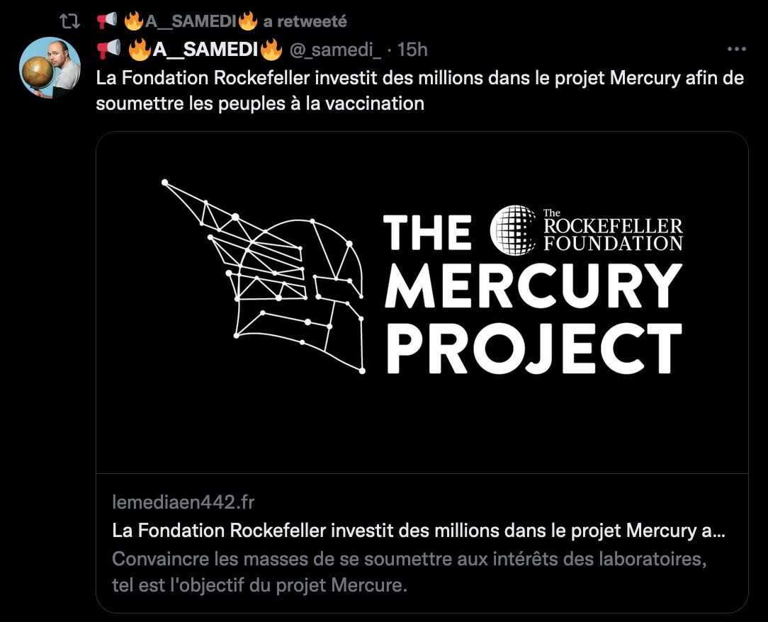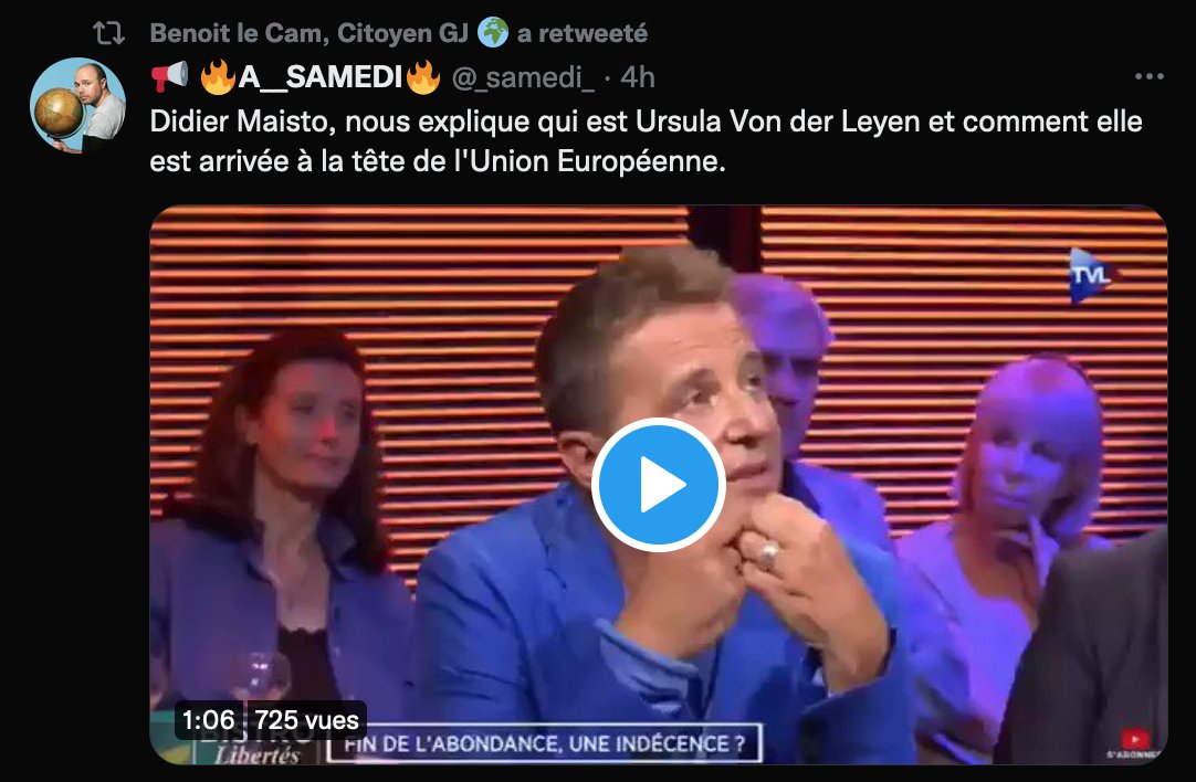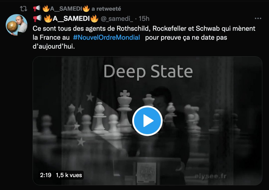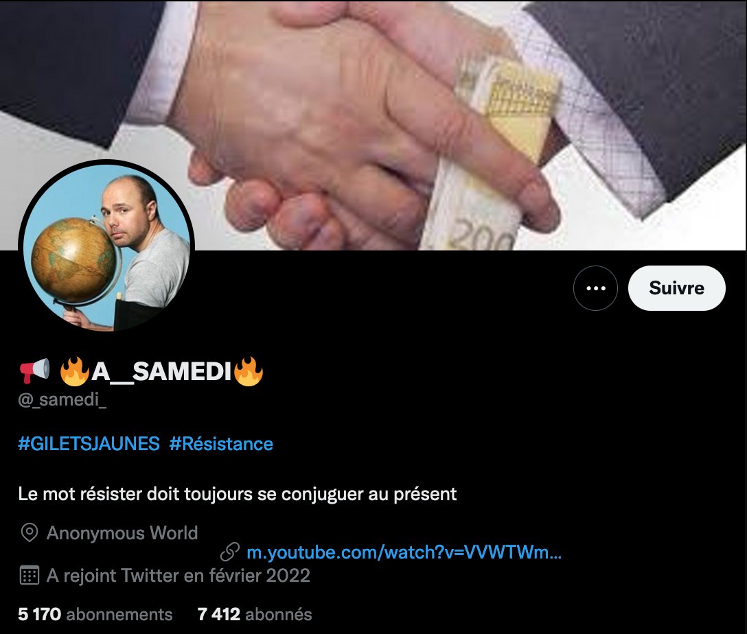 7/8Un autre profil beaucoup retweeté par @BenoitLeCam est @_samedi_, une compte GJ conspirationniste, antivax, antisémite, climatosceptique... Enfin, un compte d'extrême droite.
