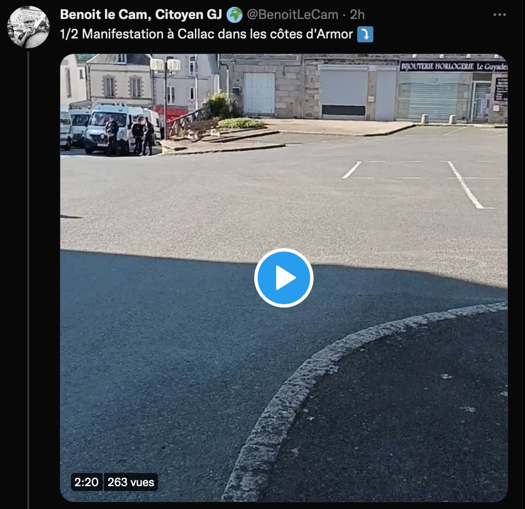 Charli a aimé et retweeté @BenoitLeCam, qui est en train de suivre la manif à Callac dans les côtes d'Armor. Benoit se présente comme un militant de gauche.