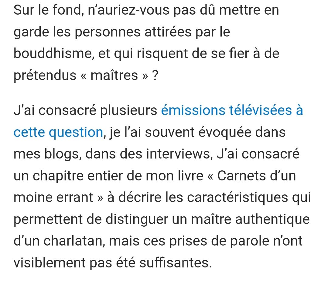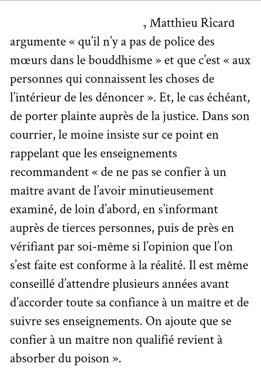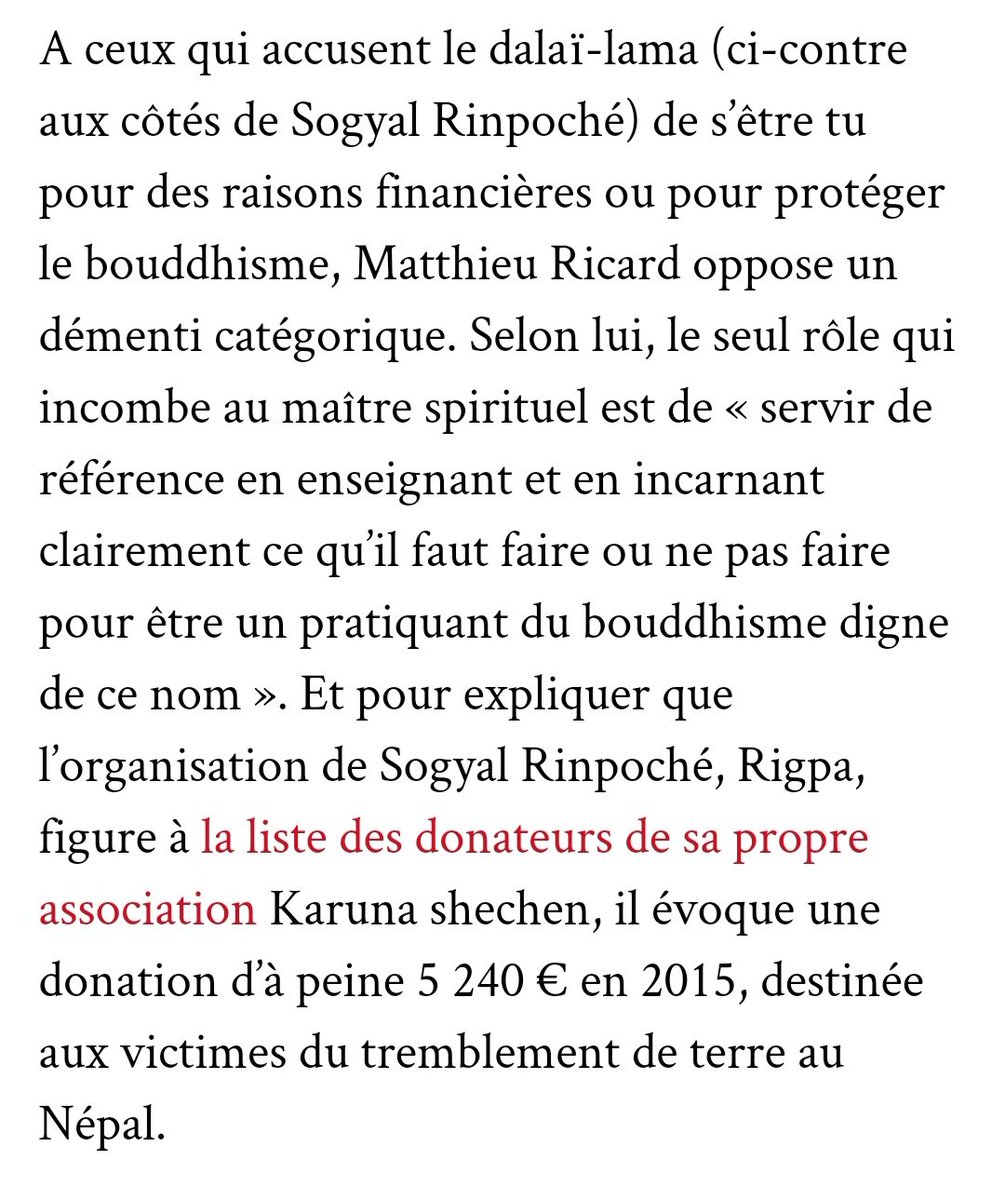 Matthieu Ricard finit donc par faire parvenir à @MarianneleMag un long plaidoyer pour ses fesses, dans lequel il explique pourquoi les mauvaises langues et les mal-comprenants ont tort, lui et le Dalaï-lama n'ont JAMAIS adoubé Sogyal Rinpoché. marianne.net/societe/scanda…