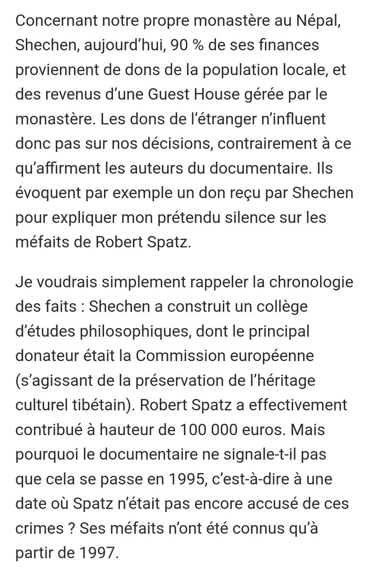 Après vient un argument de 2022 qui n'était pas là en 2017. Mais en 2017 Matthieu Ricard n'était pas autant dans la tourmente. Il se défend donc de la même accusation que celle qui touche le DL, à savoir que Robert Spatz aurait acheté son silence.