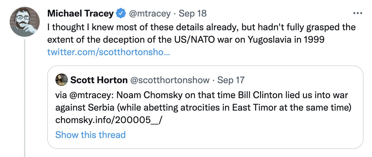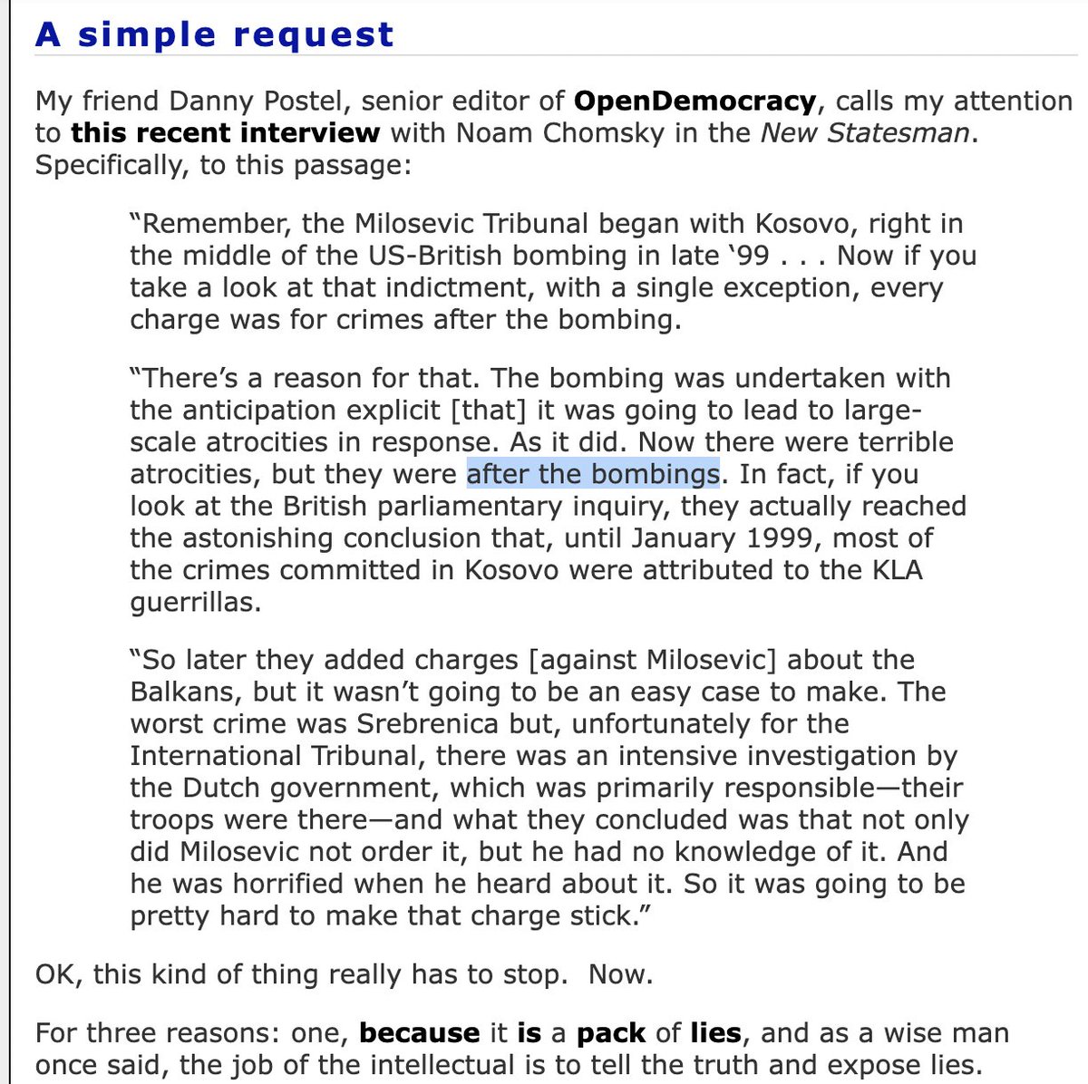 Chomsky, what a reference. 🤦♀️ He made a similar type of claim about Kosovo, btw. The usual pattern of blaming anyone (ideally, of course, the US!) but those actually responsible. chomsky.info/20060619/ web.archive.org/web/2008062119…