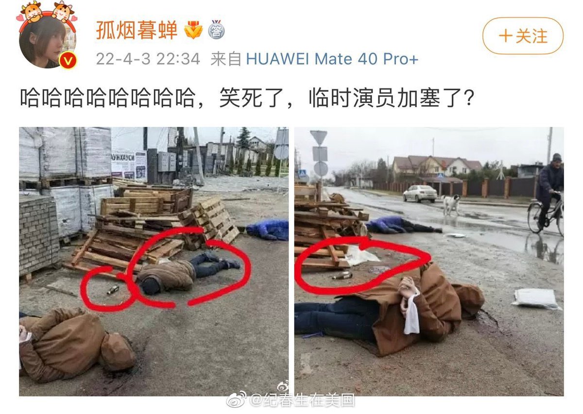 孤烟暮蝉, the notorious "patriotic" blogger (6.4M followers) on Weibo, trolled the Bucha Massacre is a poorly staged performance, "hahahahahahahaha, lmao, the extras cutting in line?"