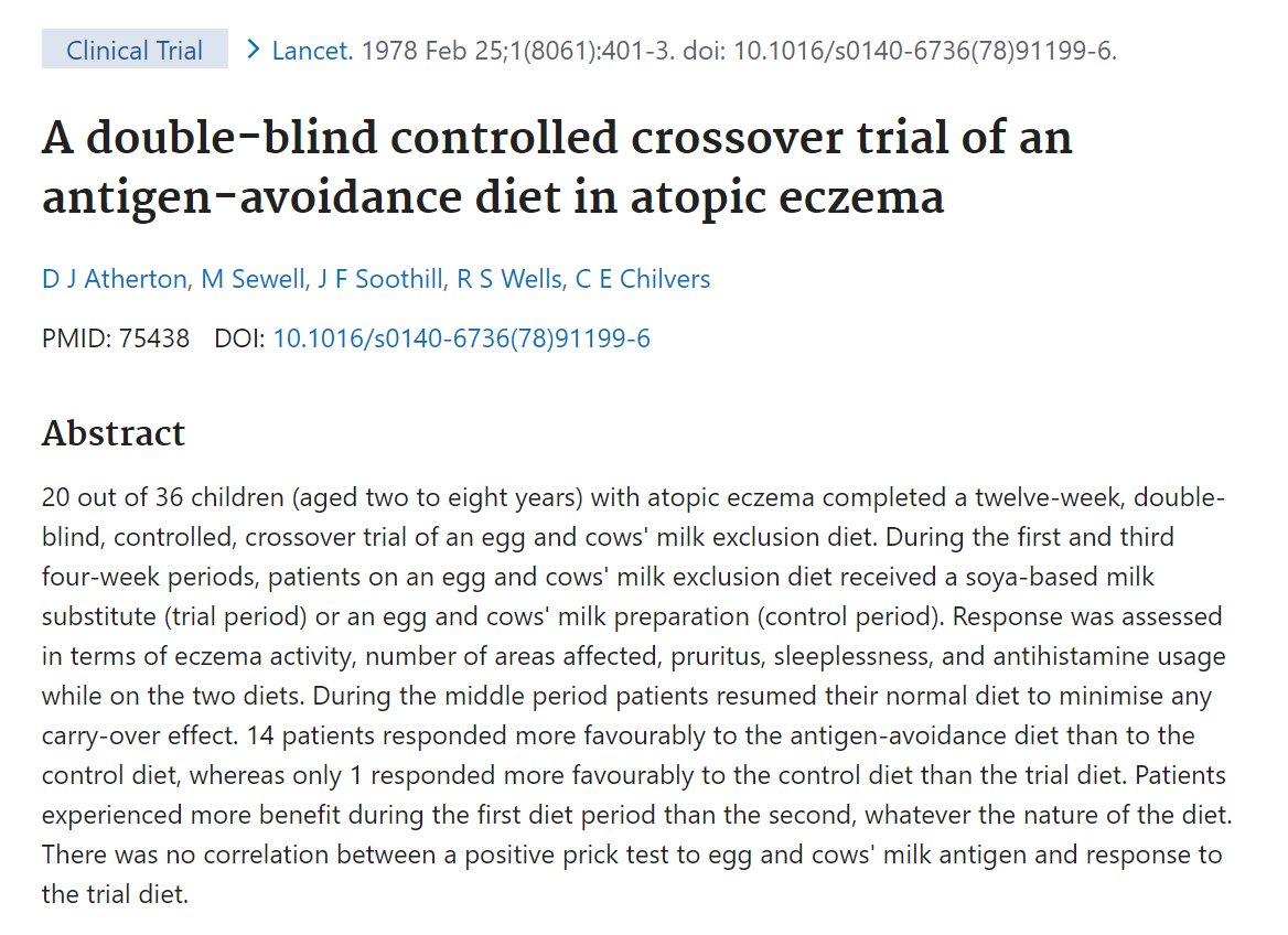 5/6 - A 1978 study (double blind crossover) of a milk and egg exclusion diet found benefit in 14 of 20 children who completed the trial (1 of 20 responded best to control diet). Possibly confounded by soya-based milk being used as an atlernative.