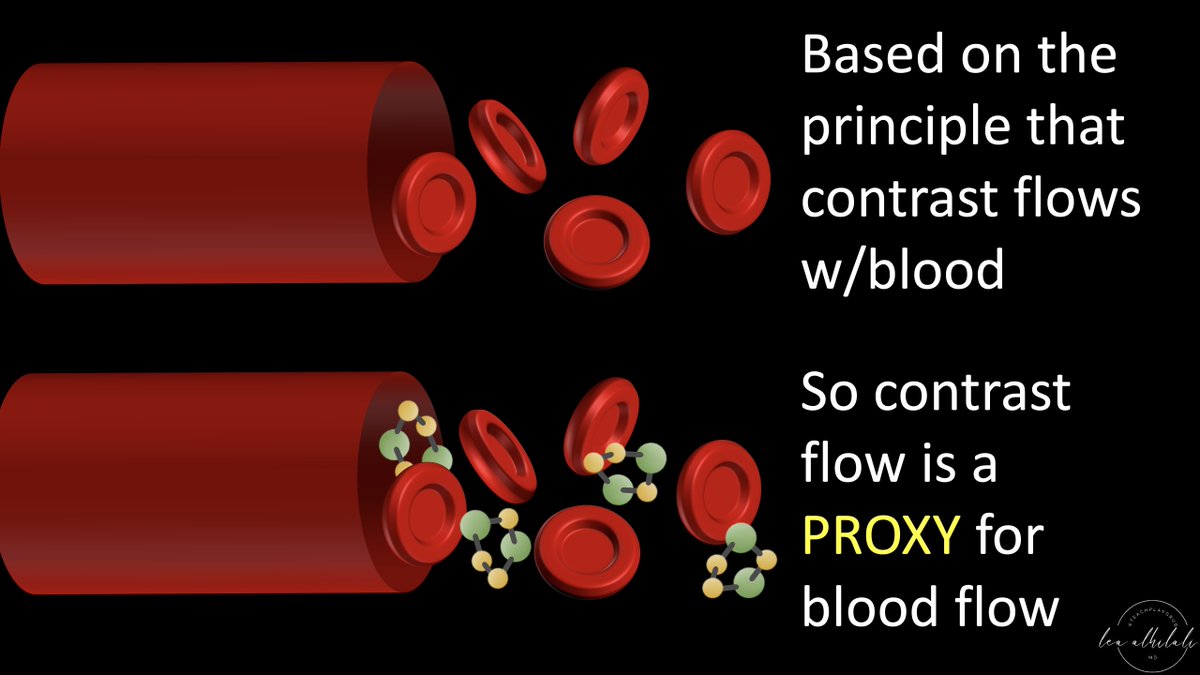 2/Perfusion imaging is based on one principle: When you inject CT or MR intravenous contrast, the contrast flows w/blood & so contrast can be a surrogate marker for blood.