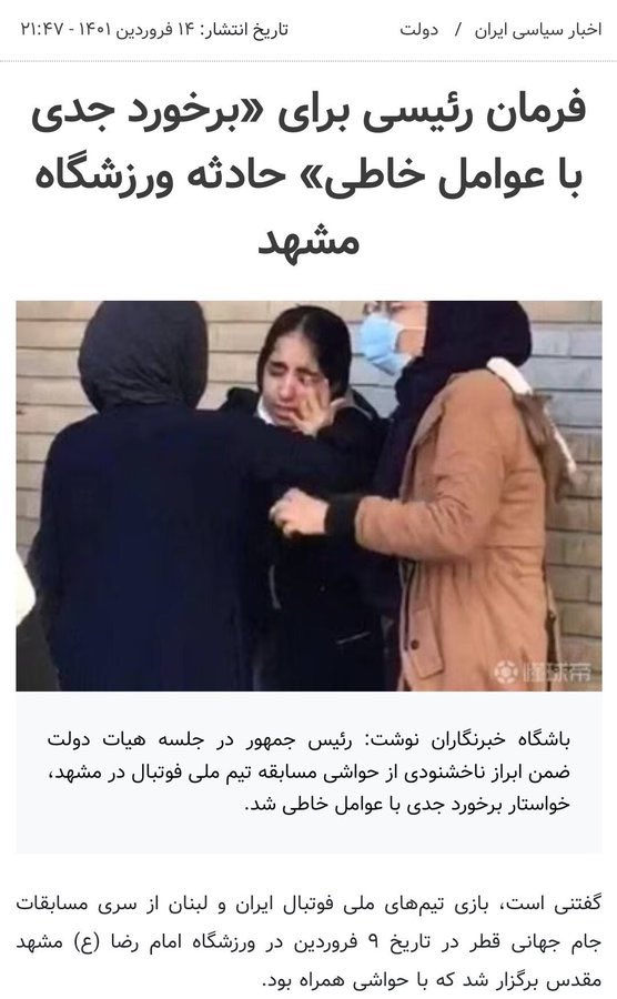 مثلا برای روشن ماجرای استادیوم مشهد و ضرب و شتم بانوان که آقای رئیسی فرمان ویژه رسیدگی داد الآن ۶ ماه است منتظریم و هنوز خبری نیست!