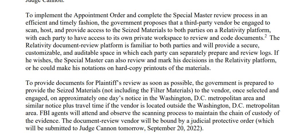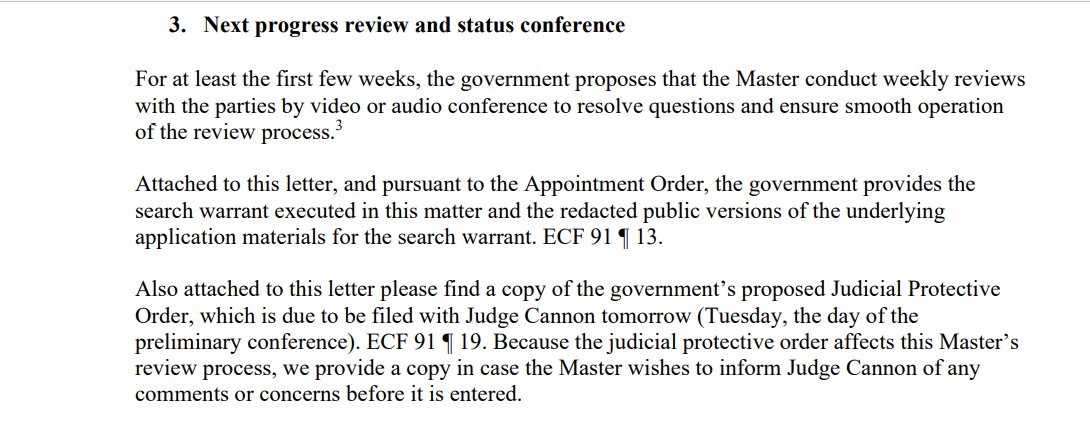 Will be curious to see how DOJ reacts to Dearie's expedited deadline. (Cannon's is Nov 30). They want to drag this out with hopes 11th Circuit overturns Cannon's order to keep "classified" records within scope of third party review. Review of "classified" docs are prioritized: