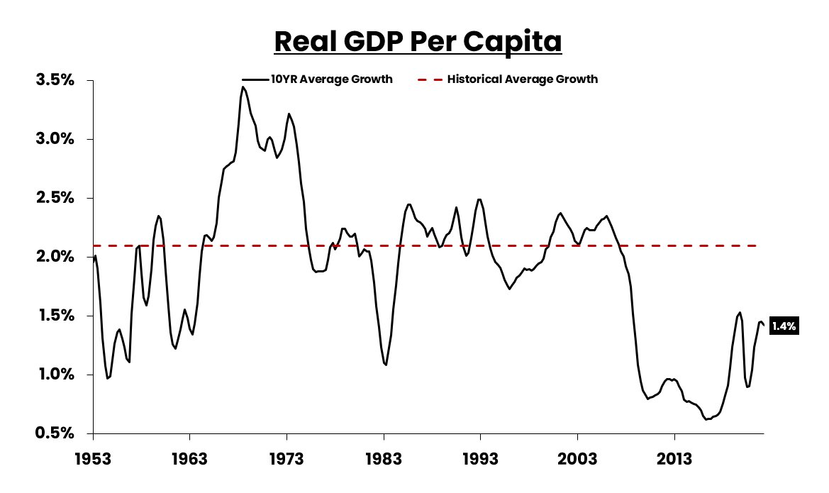 Over the long-run, economic growth is a function of population growth and productivity growth.