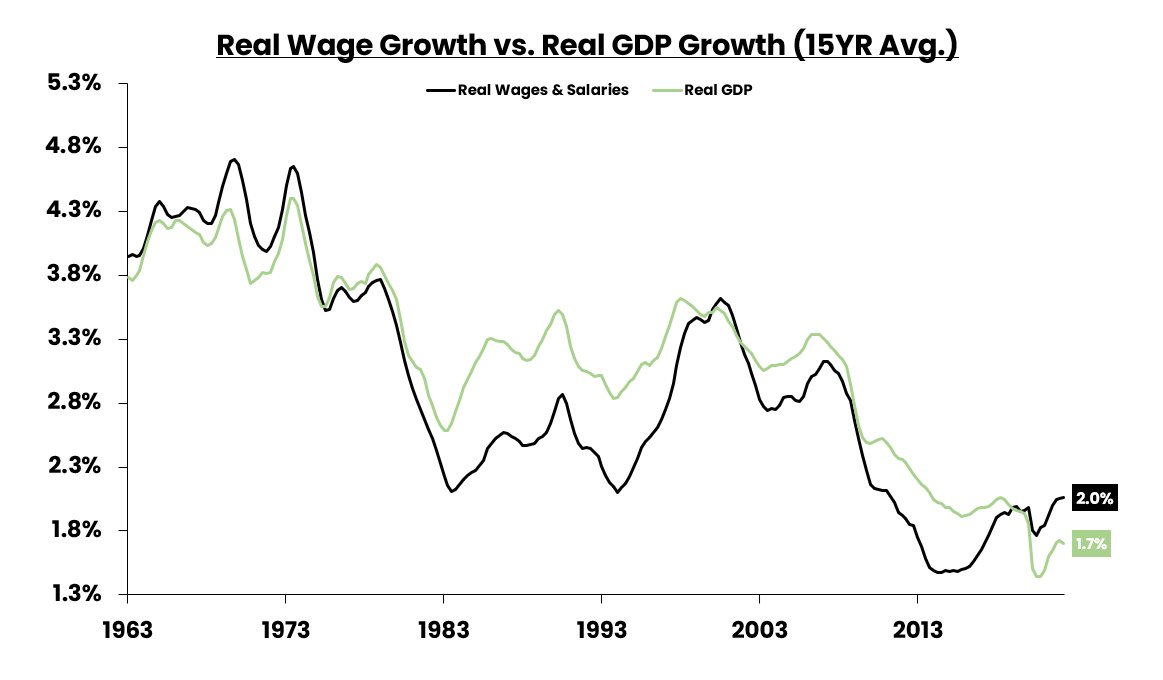 Once debt levels became excessive, there was a sharp drop in economic growth and, thus, wage growth.