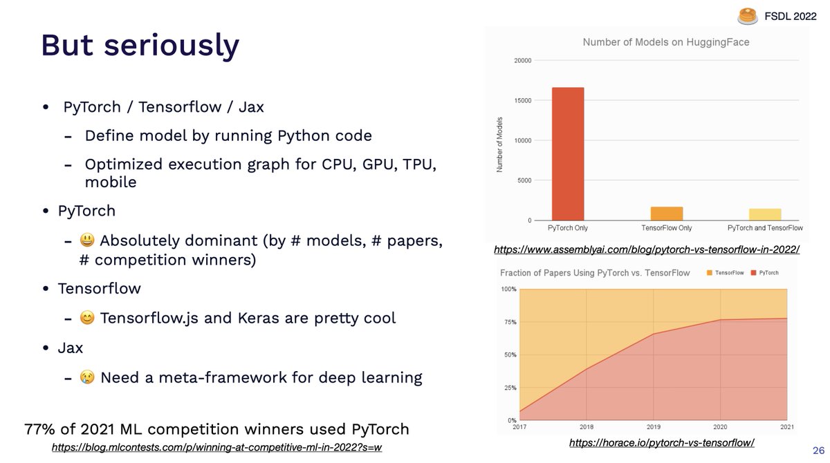 We think PyTorch is the clear pragmatic choice in 2022, but that Tensorflow is also great, and Jax could be an excellent choice if you're going off the beaten path.